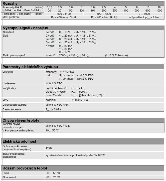 Pro silně kolísající tlaky je snímač vybaven účinným tlumením. Jako napájení se používá stejnosměrné napětí 24 VDC (odolnost proti přepólování) nebo 230 VAC (po dohodě 110 VAC , 24 VAC). Robustní provedení umožňuje použití jak v laboratořích tak i v podmínkách průmyslových provozů. Kvalitní mechanická konstrukce zaručuje udržení důležitých parametrů jako je dlouhodobá stabilita, linearita a reprodukovatelnost.