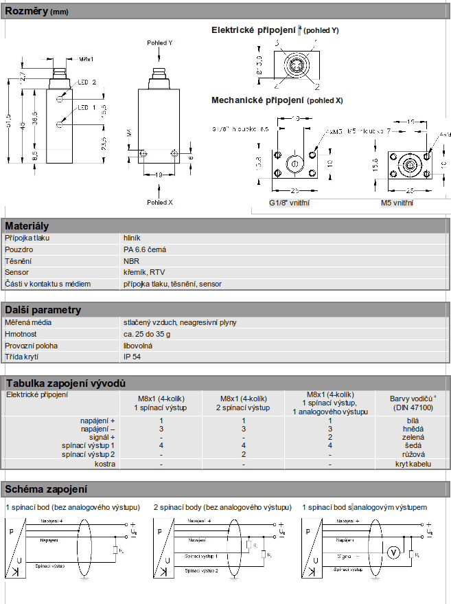 Tlakový spínač pro pneumatiku / vakuovou techniku, 1 nebo 2 spínací výstupy, spínací výstupy volně konfigurovatelné přes adaptér nebo programovací zařízení, jmenovitý tlak od 0…1 bar do 0…10 bar rovněž –1…0 bar.
