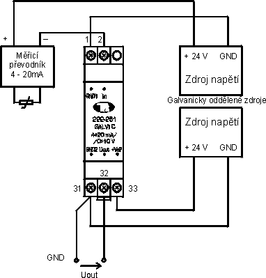 Pro správnou funkci tohoto převodníku je nutné, aby vstupní signál byl galvanicky oddělen od požadovaného výstupního signálu (nelze spojit vstupní svorku “ -IN “ se svorkou “ — “ výstupu!), jinak je nutno použít modul 222-236 GALVI D.