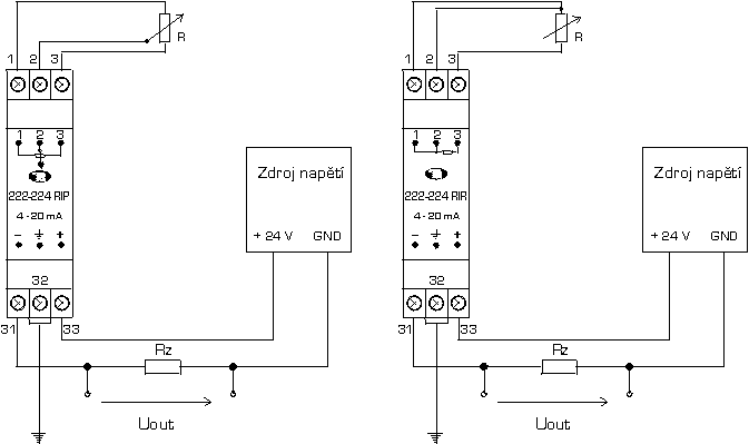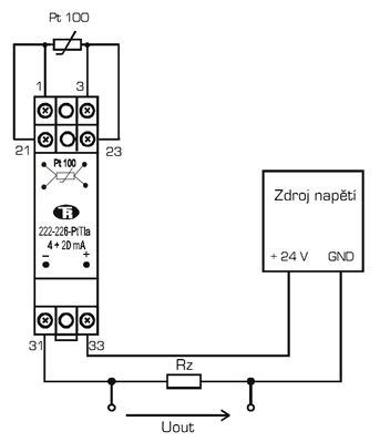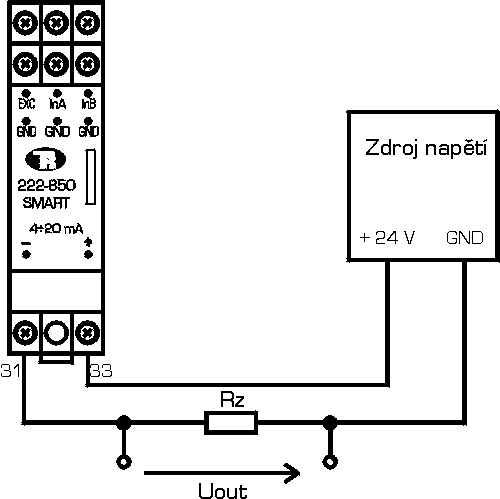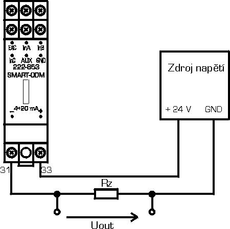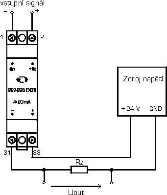 - Obr. 3b: Zapojení převodníku do obvodu - výstup 4 až 20 mA