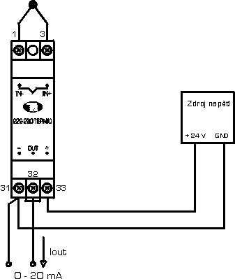 - Obr. 3a: Zapojení převodníku do obvodu - výstup 0 až 20 mA