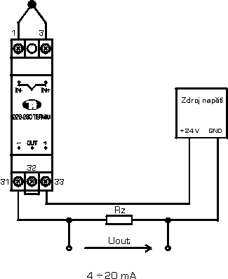 Signál z teplotního vysílače je přiveden na vstup převodníku. Obvod pracuje jako pasivní vysílač v proudové smyčce. Výstup převodníku slouží zároveň k jeho napájení.Převodník není vybaven galvanickým oddělením vstupního a výstupního signálu.
