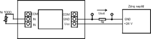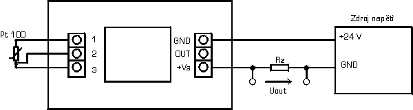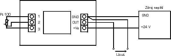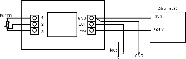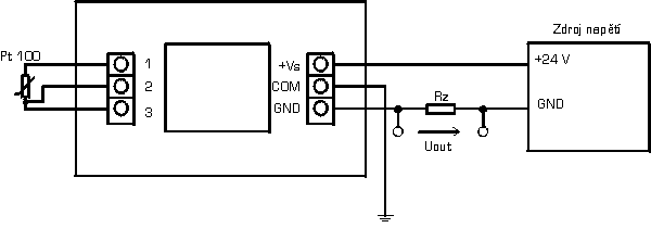 Signál z teplotního vysílače je přiveden na vstup převodníku. Obvod pracuje jako pasivní vysílač v proudové smyčce. Výstup převodníku slouží zároveň k jeho napájení. Převodník není vybaven galvanickým oddělením vstupního a výstupního signálu.