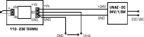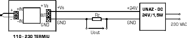 Činnost podle této statě smí vykonávat pracovníci alespoň znalí dle §5 vyhlášky 50/1978 Sb., resp. 51/1978 Sb.Převodník 110 – 230 TERMIU se upevňuje šroubováním na základní desku pomocí čtyř šroubů M5. Kryt převodníku se musí uzemnit v označeném bodě (značka na krytu). Svorkovnice jsou přístupné po odšrubování víčka. Svorku COM je nutno dobře uzemnit (na šasi rozvaděče, případně na GND napájecího zdroje). Připojovací kabely se provlečou těsnícími průchodkami a vývody se zapojí dle obr.3. Vnitřní průměr těsnění musí odpovídat průměru kabelu. Těsnící průchodky kabelů se dokonale utáhnou pomocí stranového klíče OK 22. Nakonec se přišroubuje krycí víčko.Doporučuje se orientovat kryt převodníku tak, aby průchodky kabelů nebyly orientovány směrem nahoru.V případě nutnosti dostavení měřicího rozsahu převodníku je možno po sejmutí víčka krabičky nastavit rozpětí a nulu převodníku pomocí hodinářského šroubováku. Pozice nastavovacích trimrů je uvedena v obr. 2. K napájení převodníku se doporučuje stabilizovaný zdroj 222 – UNAZ-DC 24V/1,5W (výrobce TRESTON spol. s r.o.).
