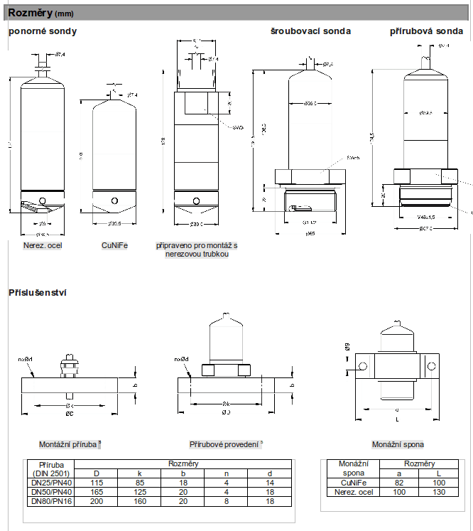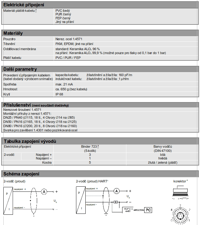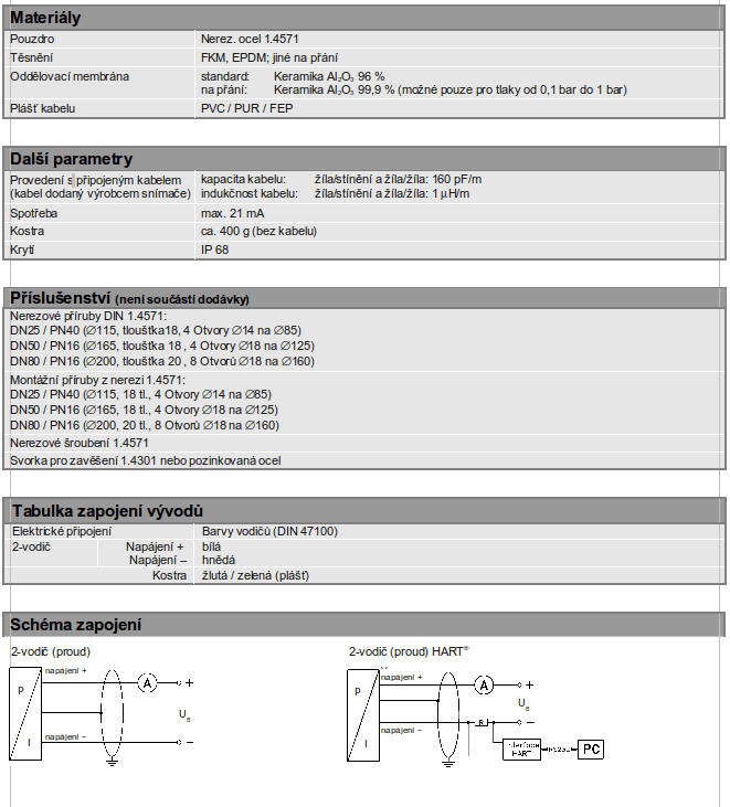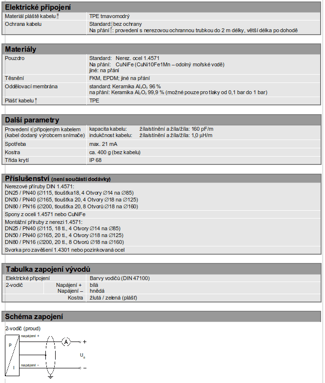 Hydrostatické snímače výšky hladiny pro lodní výstroj, kapacitní keramický senzor, materiály: 1.4571; na přání CuNiFe, ponorné nebo přírubové provedení, jmenovité rozsahy od 0…40 cmH2O do 0…200 mH2O (0…40 mbar do 0…20 bar).