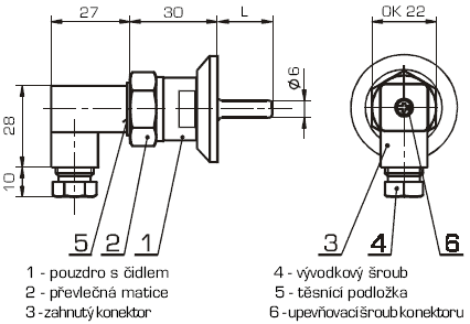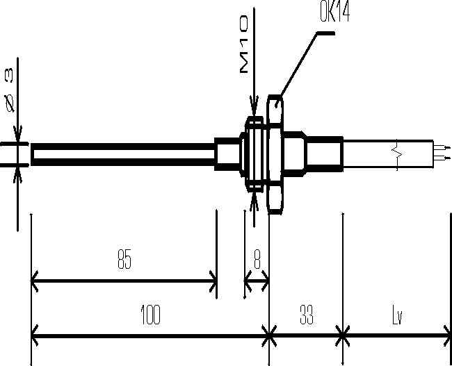 Jednoduchý izolovaný termoelektrický snímač typu “K“ v pouzdře se závitem M10 (vyrobeno z nerez oceli 17 240) s kompenzačním vedením, o průřezu 2 x 0,5mm. Plášť termočlánku je v mater. provedení INCONEL 600 (2.4816) o průměru 3mm.