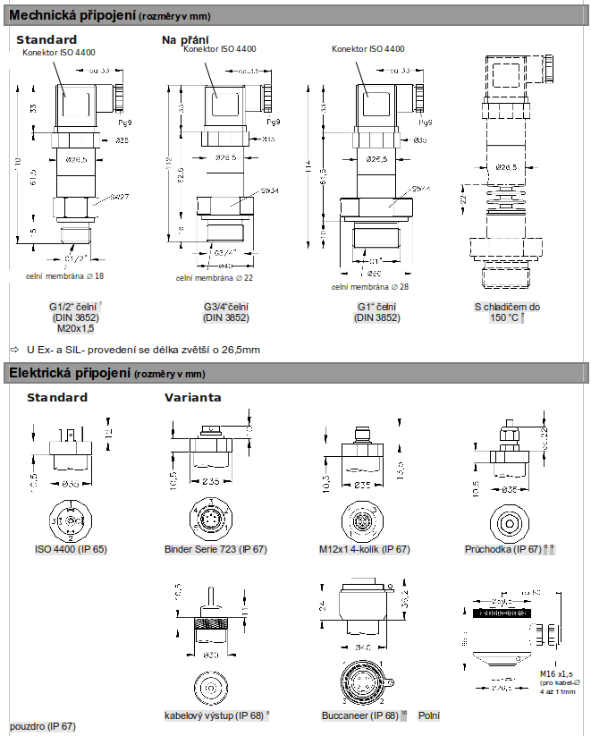 Jiné materiály je možno dodat dle dohody K dispozici jsou vedle silikonového oleje další varianty náplní. Pro měření tlaku médií s vysokou teplotou je možno snímač osadit integrovaným chladičem. Široká paleta elektrických výstupních signálů, elektrických i mechanických připojení umožňuje beze zbytku splnit požadavky procesu.