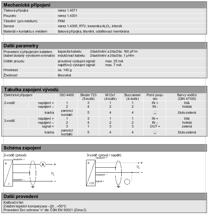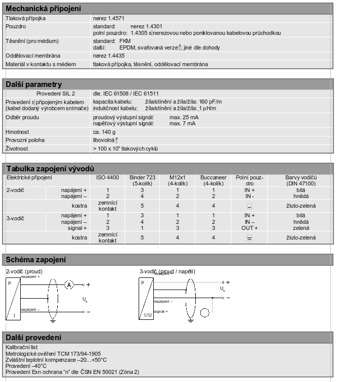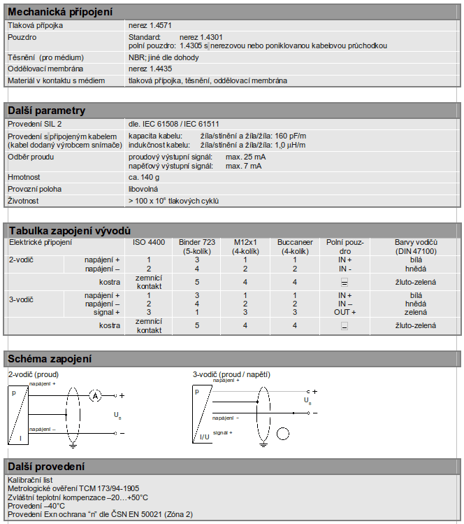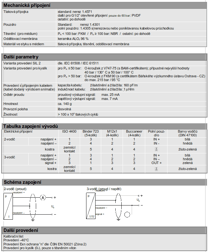 Průmyslový snímač tlaku, piezoresistivní nerezový, sensor přesnost dle IEC 60770: 0,35 %, 0,25 %, 0,20 %, 0,10 % FSO, jmenovitý tlak od 0…100 mbar do 0…40 bar.