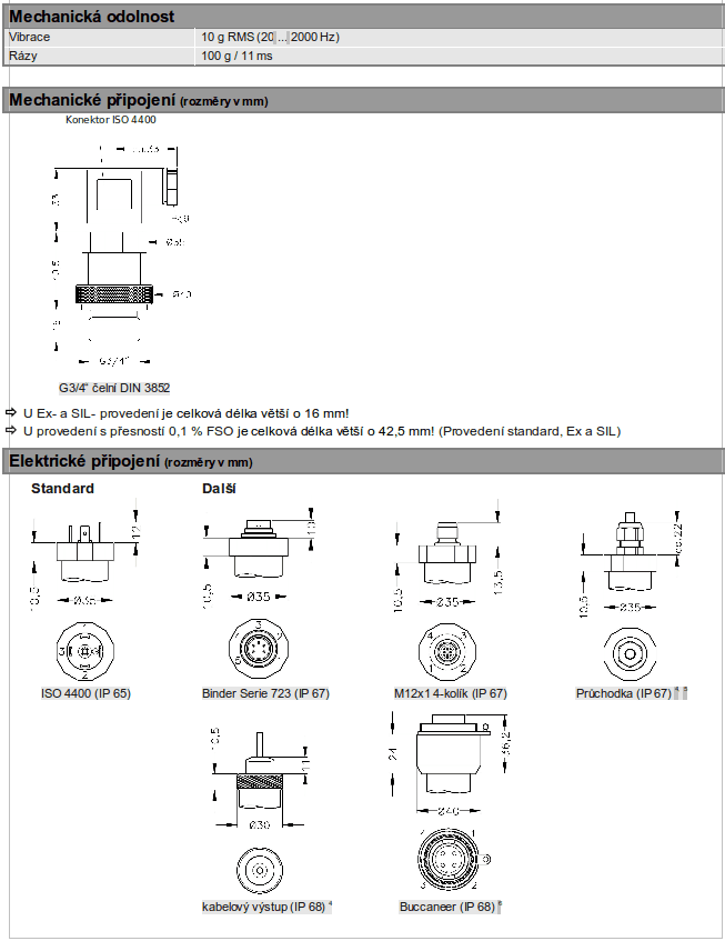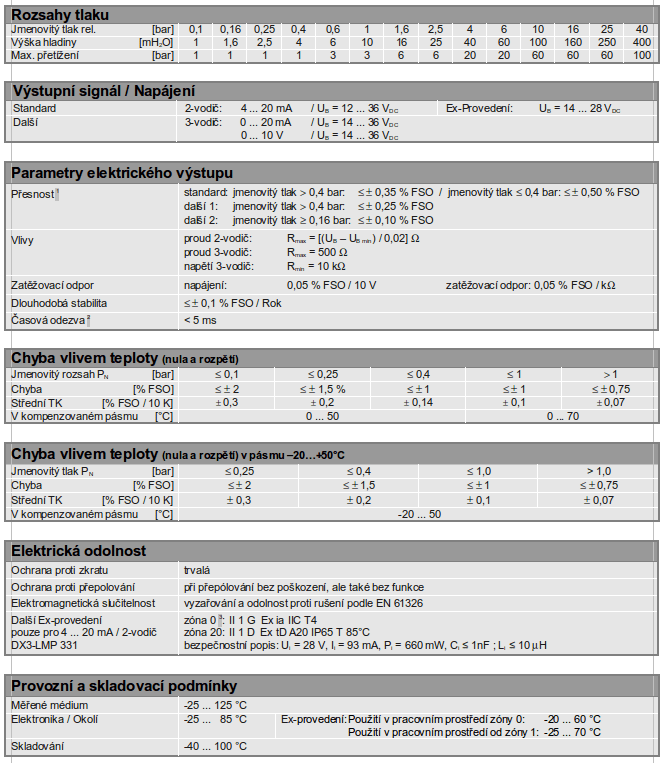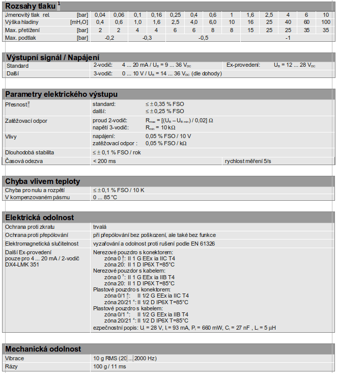 - <ul><li>nízká chyba vlivem teploty</li><li>velmi dobrá linearita</li><li>dlouhodobá stabilita</li><li>přesnost dle IEC 60770: 0,35 %</li><li>další: 0,25 % / 0,1 % FSO provedení Ex: II 1 G Ex ia IIC T4 (pouze pro 4 … 20 mA / 2-vodič)</li><li>TÜV 03 ATEX 2005 X</li><li>zákaznické provedení: zvláštní rozsahy</li></ul>
