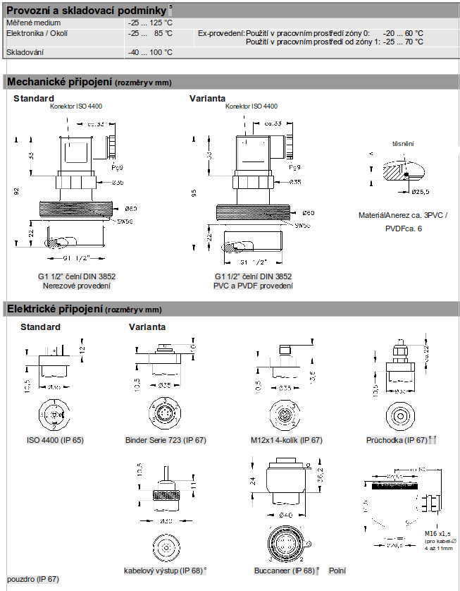 Vestavná sonda, kapacitní keramický sensor, čelní membrána, jmenovitý tlak 0…40 mbar do 0…10 bar (0 … 40 cmH2O do 0 … 100 mH2O), přesnost dle IEC 60770: 0,35 % FSO další: 0,25 % FSO.