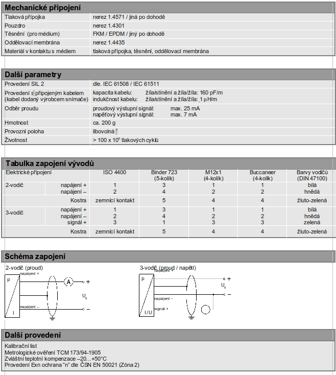 - další: 0,25 % / 0,1 % FSO provedení Ex: II 1 G Ex ia IIC T4 (pouze pro 4 … 20 mA / 2-vodič)