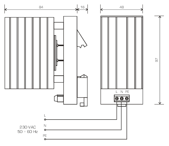 Topidlo 555 TLV 30 se upevňuje nasunutím na lištu DIN TS35. Nejprve nasadíme horní trn držáku topidla na horní hranu lišty a pomocí šroubováku (max. 4x1mm) povysuneme jemným páčením zámek dolního aretačního trnu. Dotlačíme spodní část topidla na lištu a poté zámek uvolníme. Tím se topidlo přichytí na lištu. Obdobně lze topidlo z lišty sejmout. Připojovací kabely se zapojí do svorkovnice dle obr.1 a platných předpisů. Topidla se montují do spodní řady v rozvaděči, nebo do řady těsně pod vyhřívané prvky. Účinnost vytápění se výrazně zvýší dobrým utěsněním spár a otvorů v rozvaděči a jeho tepelnou izolací. Topidlo 555 TLV 30 je určeno výhradně k montáži do rozvaděčů, či rozvodných skříní, kde je žádáno vytápění teplotně choulostivých součástí.